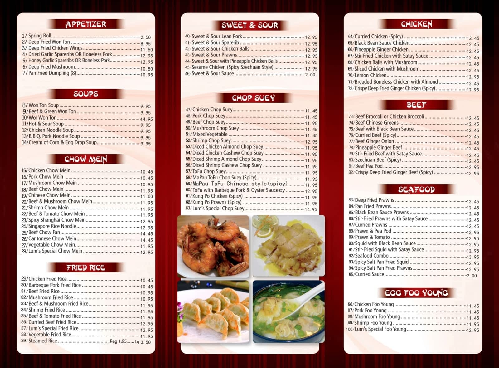 Six spring rolls deep-fried prawns breaded almond chicken sweet-and-sour lean pork house special fried rice house special chow mein and house special chop suey. Lums Chinese Restaurants affordable prices make our restaurant a natural choice for everyday meals in the Victoria community. Four spring rolls deep-fried prawns barbeque pork chow mein chicken fried rice house chop suey and sweet-and-sour lean pork.